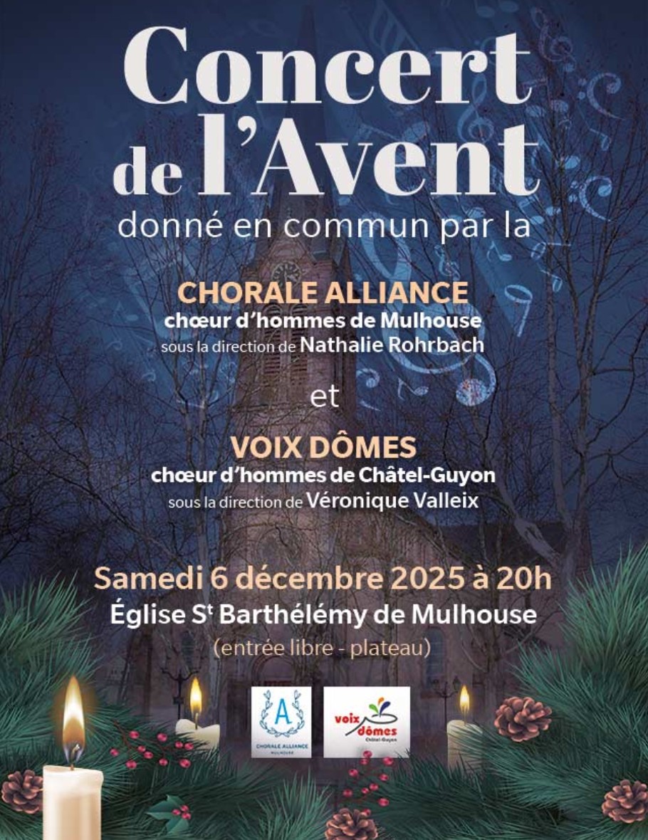 Du 5 au 7/12/2025, le choeur s’est rendu à Mulhouse (68) à l’invitation du choeur d’homme « L’Alliance ». Les 2 choeurs ont donné un concert commun à 20h le 6/12/2025 en l’église St Barthélémy de Mulhouse.
