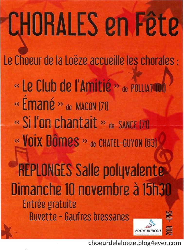 Le dimanche 10 novembre, Le Chœur de la Loëze, de Replonges dans l’Ain (près de Mâcon), nous accueille à l’occasion d’un rassemblement « Chorales en fête » qu’il organise.